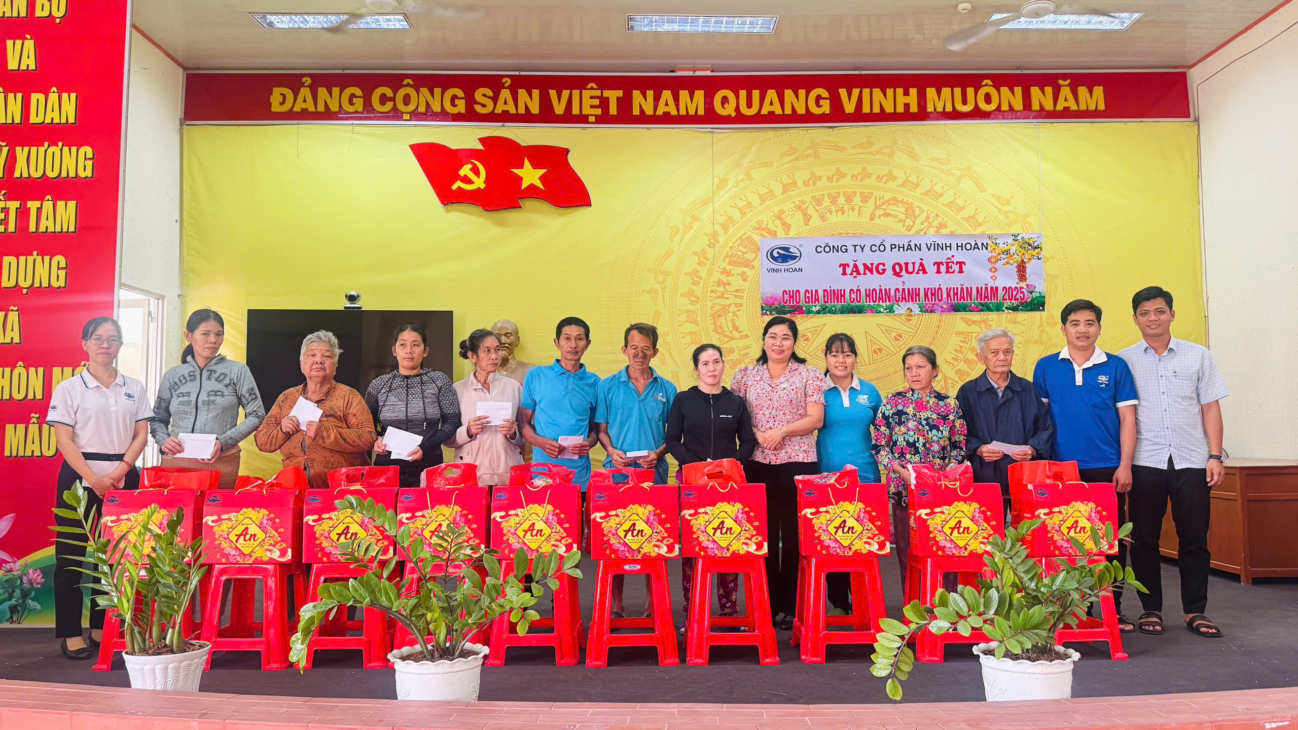 Dịp này, Cty Vĩnh Hoàn đã trao 30 phần quà Tết cho 30 gia đình có hoàn cảnh khó khăn, mỗi phần quà trị giá 700.000đ (Bảy trăm ngàn đồng) gồm: tiền mặt, gạo và các nhu yếu phẩm. Tổng trị giá của đợt tặng quà lần này là 21.000.000đ (Hai mươi mốt triệu đồng)./.