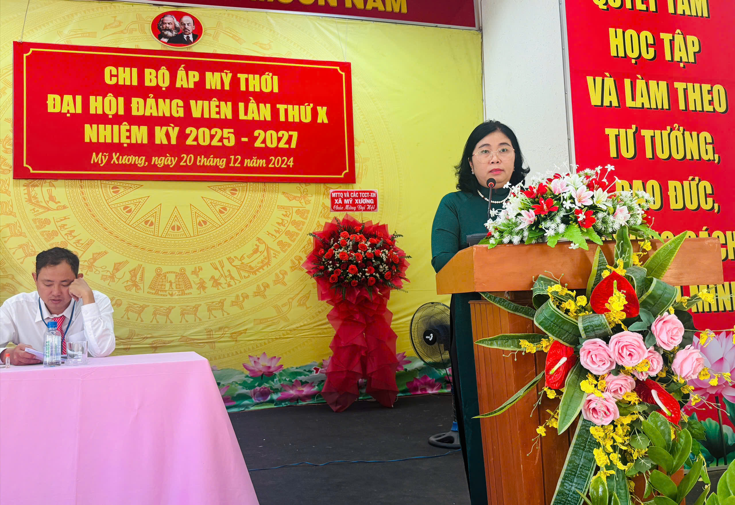 Phát biểu chỉ đạo tại Đại hội đồng chí Nguyễn Thị Thuỳ Trang, Bí thư Đảng uỷ xã Mỹ Xương ghi nhận những kết quả đạo được của chi bộ ấp Mỹ Thới trong nhiệm kỳ qua và đề nghị Chi uỷ chi bộ ấp tiếp tục tổ chức thực hiện có hiệu quả các chỉ tiêu chủ yếu nhiệm kỳ 2025 – 2027, tập trung công tác xây dựng tổ chức tổ chức đảng, đoàn thể; kinh tế; văn hoá xã hội; an ninh trật tự và 3 nhiệm vụ đột phá. Đặc biệt là vận động đảng viên và nhân dân thực hiện duy trì các tiêu chí xã nông thôn mới nâng cao, nông thôn mới kiểu mẫu; vận động tiểu thương và nhân dân tham gia thực hiện chợ thanh toán không dùng tiền mặt, chợ an toàn vệ sinh thực phẩm hướng đến xây dựng xã Thương mại điện tử; quan tâm hơn công tác an sinh xã hội, an toàn trật tự; phát triển đảng viên; xây dựng chi bộ trong sạch vững mạnh.