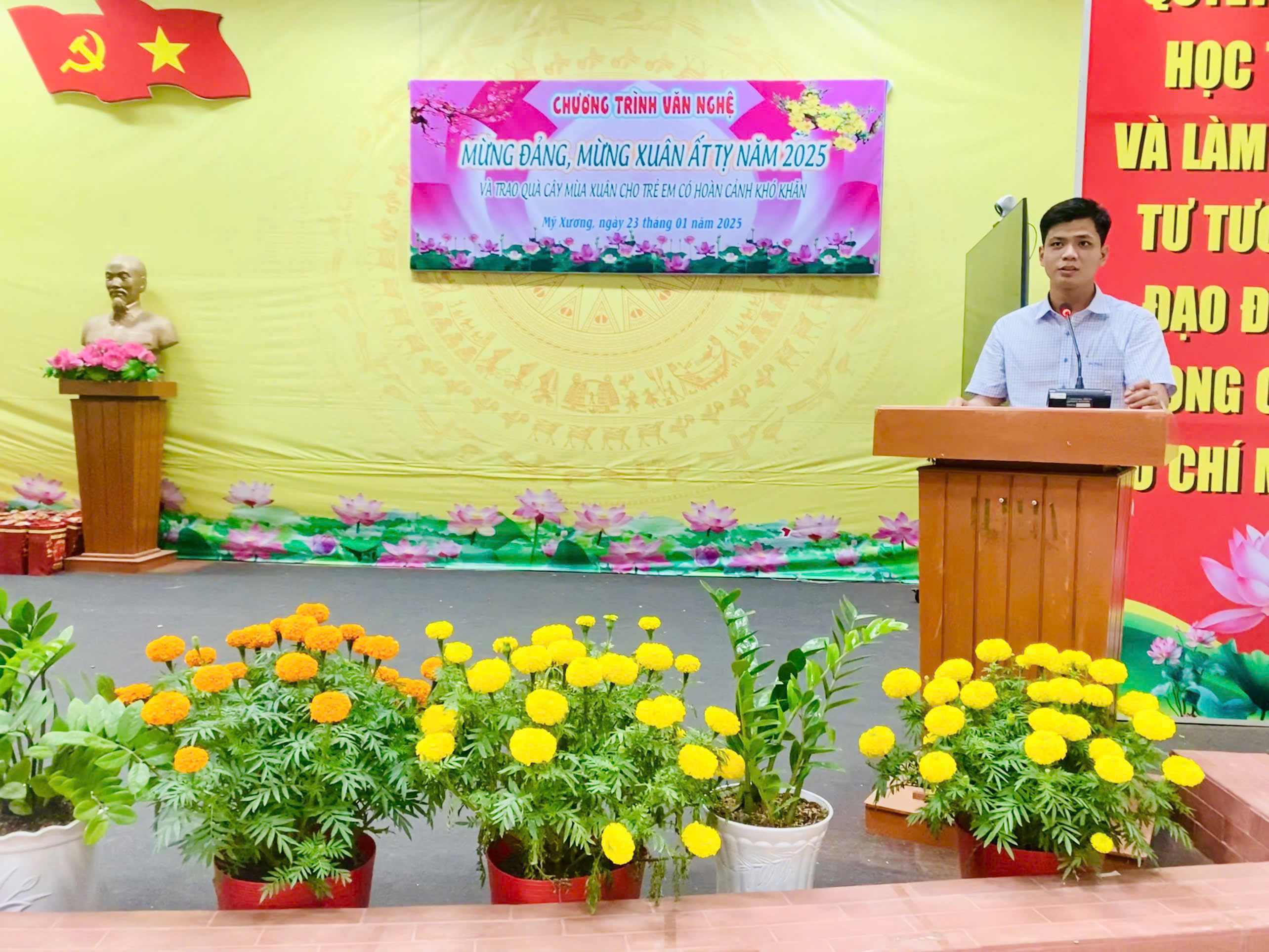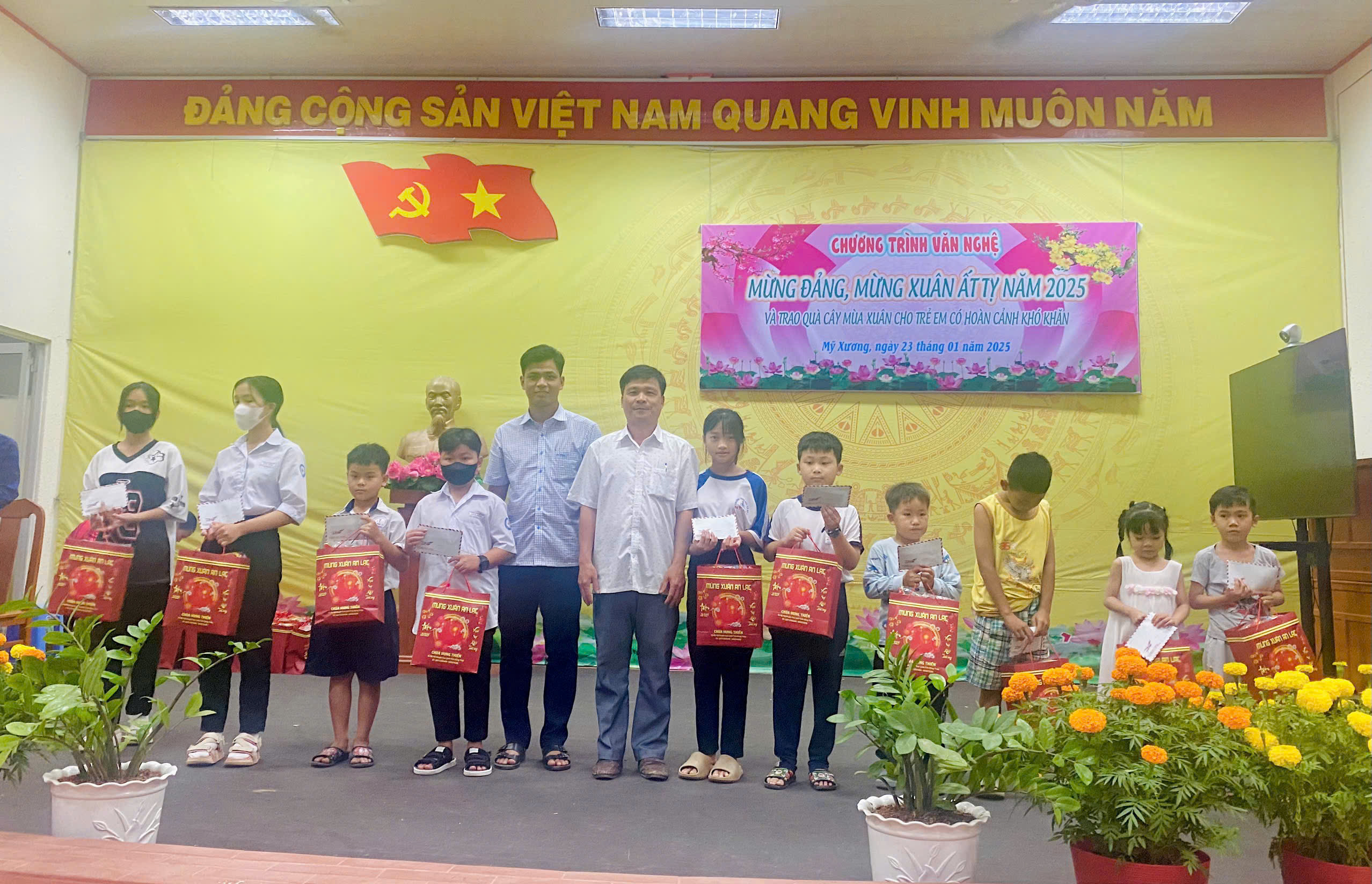 Được sự cho phép của lãnh đạo đảng uỷ, chiều ngày 23/01/2025, UBND xã tổ chức chương trình văn nghệ đặc biệt “Mừng Đảng - Mừng Xuân Ất Tỵ năm 2025” và trao quà Cây mùa xuân cho trẻ em có hoàn cảnh đặc biệt khó khăn trên địa bàn xã Mỹ Xương.