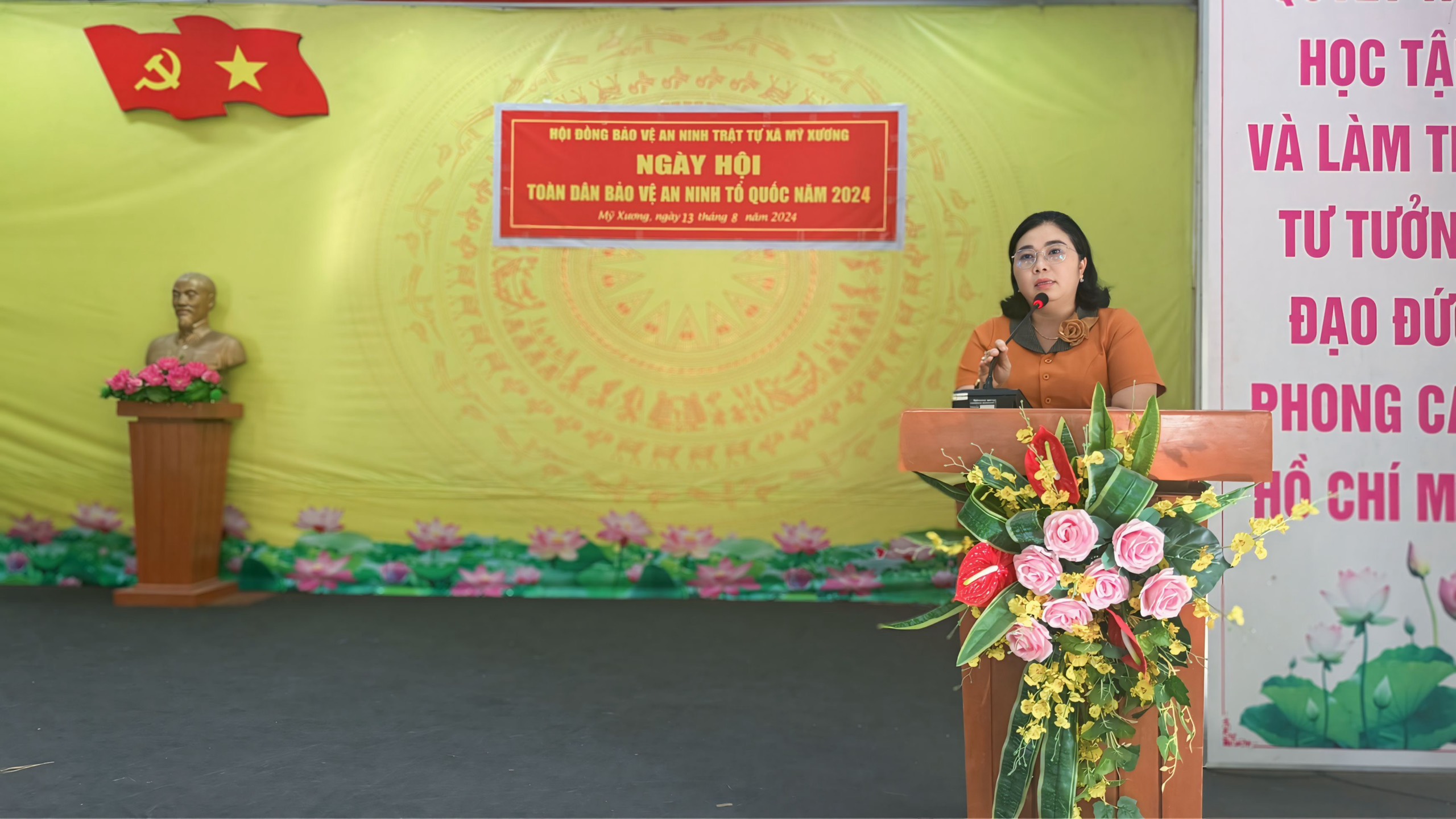 Phát biểu tại ngày hội, đồng chí Nguyễn Thị Thùy Trang, Bí thư đảng ủy/ Chủ tịch UBND xã ghi nhận, đánh giá cao những kết quả, thành tích đã đạt được trong phong trào toàn dân bảo vệ ANTQ của địa phương. Thời gian tới, đề nghị các cấp, các ngành, đoàn thể tiếp tục đổi mới, nâng cao chất lượng hiệu quả thực hiện chương trình phối hợp hoạt động, nhằm phát huy sức mạnh tổng hợp của khối đại đoàn kết toàn dân tham gia phong trào và tổ chức Ngày hội toàn dân bảo vệ ANTQ. Phát huy tốt vai trò của các Bí thư Chi bộ, Trưởng ấp, người có uy tín, phẩm chất năng lực tốt để bổ sung cho đội ngũ cơ sở tham gia phong trào Toàn dân bảo vệ ANTQ đạt hiệu quả cao nhất. Nghiên cứu, đổi mới về nội dung, hình thức, biện pháp công tác xây dựng nông thôn mới kiểu mẫu.